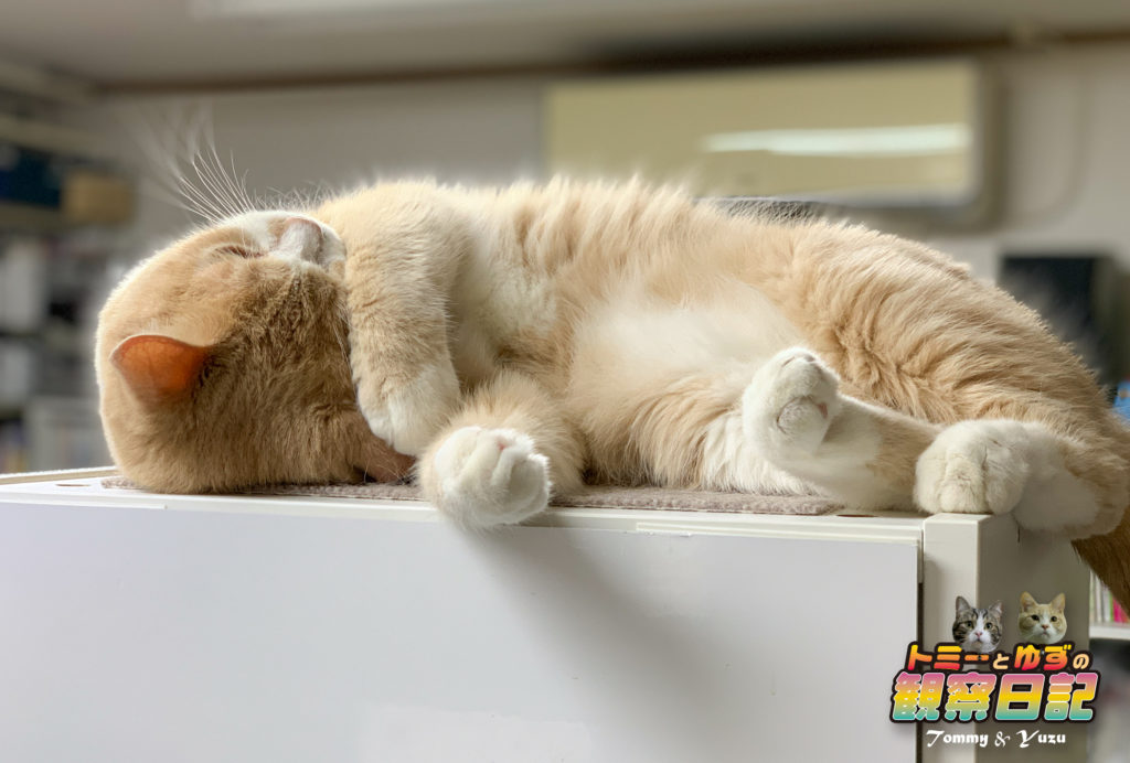 最近はこんな感じで棚の上でのお昼寝が多いかな…